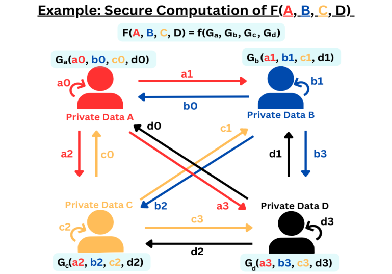 Consider the scenario illustrated in Figure 1. Four parties are involved in this scenario, each possessing data required for securely computing a function, F. Let’s designate these parties as party 0 (holding data A), party 1 (holding data B), party 2 (holding data C), and party 3 (holding data D). In this example, each party generates random shares of its private data. For instance, party 0 splits its private data A into random shares a0, a1, a2, and a3. These shares are then distributed to party 0, party 1, party 2, and party 3 respectively. Each party upon receiving the random shares of all the parties, computes it’s local function, G, on the received shares. The local computations collectively yield results that, when combined with those of other parties, enable the reconstruction of the final answer for the function F(A, B, C, D). Importantly, none of the parties can gain knowledge of the private data held by the others solely by using the received random shares. The protocol is designed to ensure that the local function G and the subsequent reconstruction consistently provide the correct answer for F, all while preserving the confidentiality of the private data.